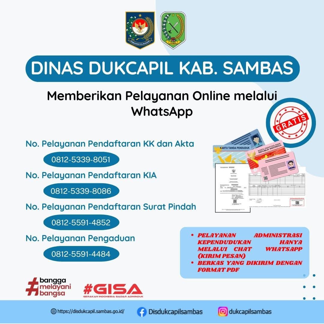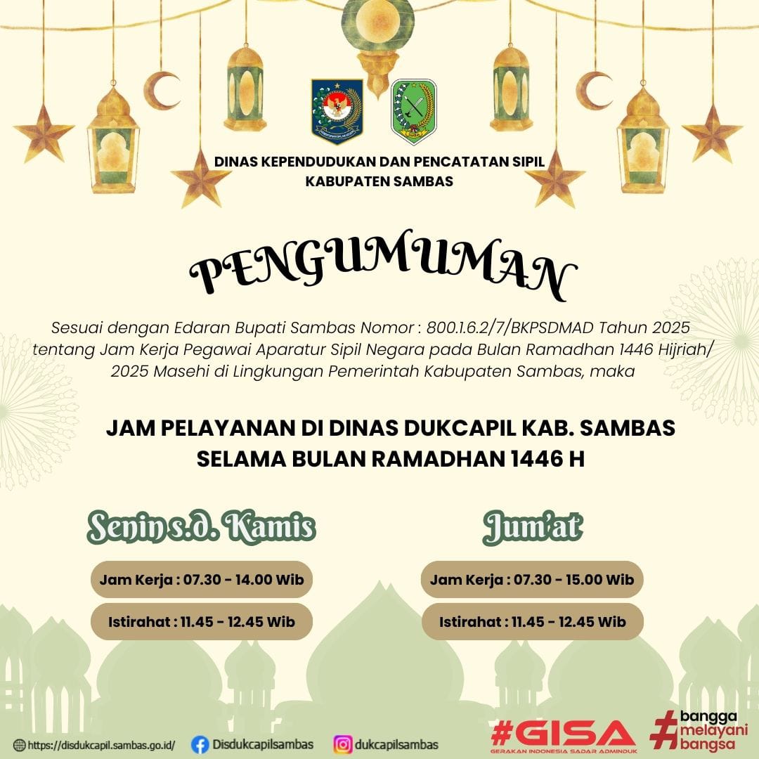 Sesuai dengan Edaran Bupati Sambas Nomor:800.1.6.2/7/BKPSDMAD Tahun 2025 tentang Jam Kerja Pegawai Aparatur Sipil Negara pada Bulan Ramadhan 1446 H/2025 Masehi di Lingkungan Pemerinta Kabupaten Sambas Maka Jam Pelayanan di Dinas Dukcapil Kab.Sambas Selama bulan ramadhan 1446 H adalah Senin - kamis 07.30 - 14.00 wib. Jum'at 07.30 WIB - 15.00 WIb Terimakaih.