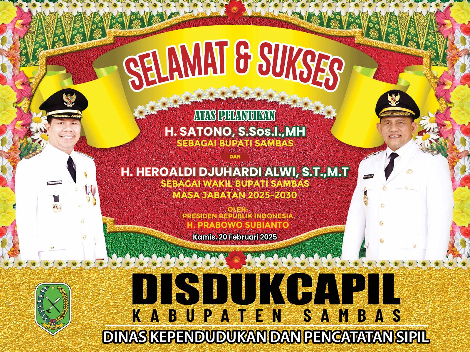 SELAMAT DAN SUKSES ATAS PELANTIKAN H.SATONO,S.Sos.I.,MH SEBAGAI BUPATI SAMBAS DAN H.HEROALDI DJUHARDI ALWI,S.T.,M.T SEBAGAI WAKIL BUPATI SAMBAS MASA JABATAN 2025 - 2030