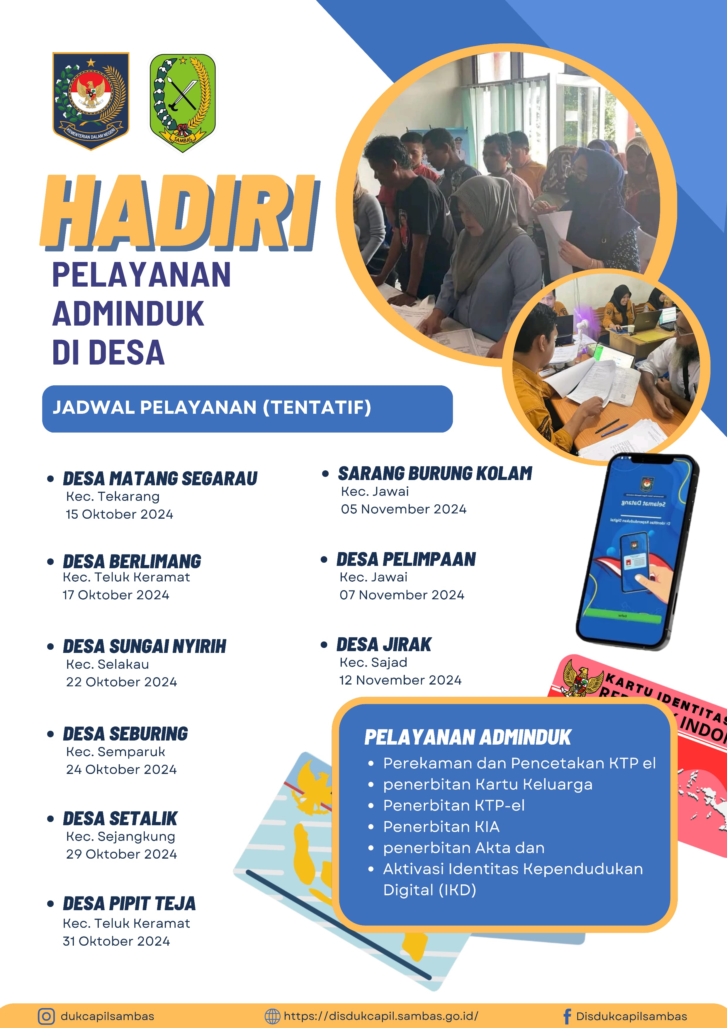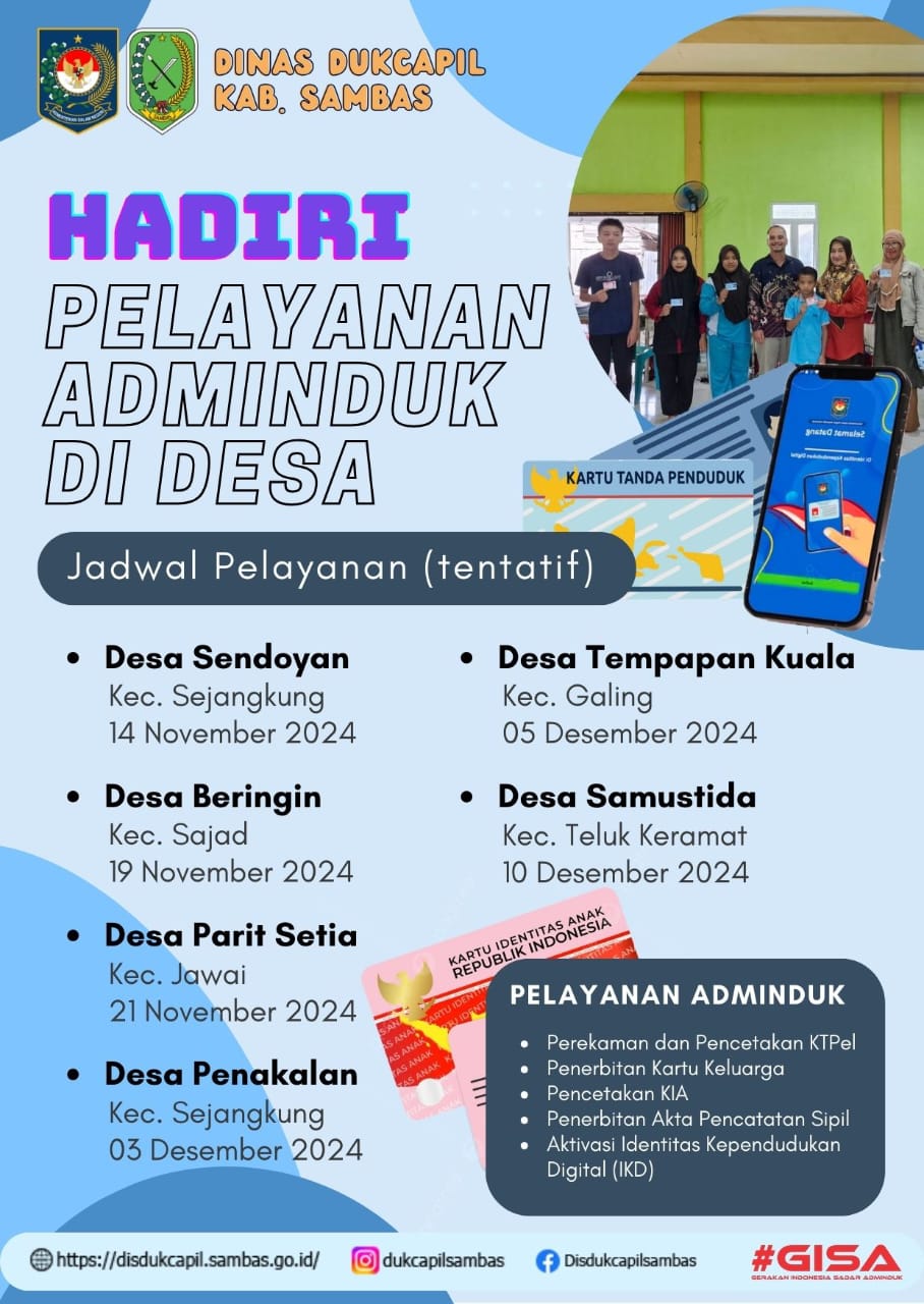Dalam rangka tertib administrasi kependudukan Di Desa, Dinas Kependudukan dan Pencatatan Sipil Kab. Sambas menberikan kemudahan pelayanan dokumen kependudukan melalui pelayanan keliling (mobile) pendaftaran penduduk dan pencatatan sipil di Desa.