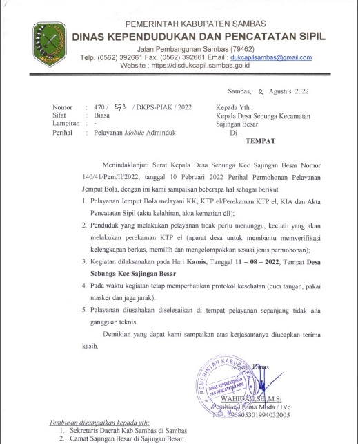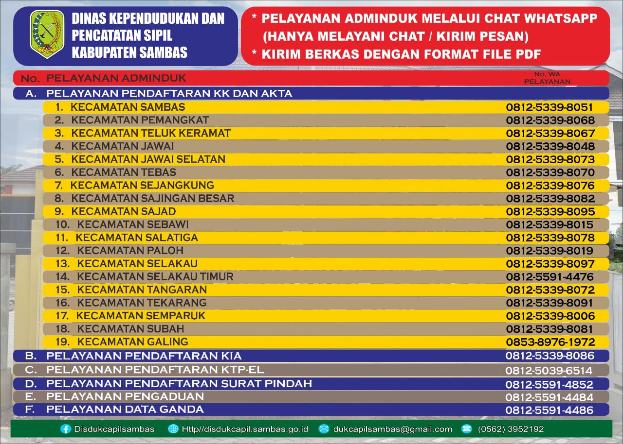 NOMOR PELAYANAN WA DISDUKCAPIL KAB SAMBAS TAHUN 2023