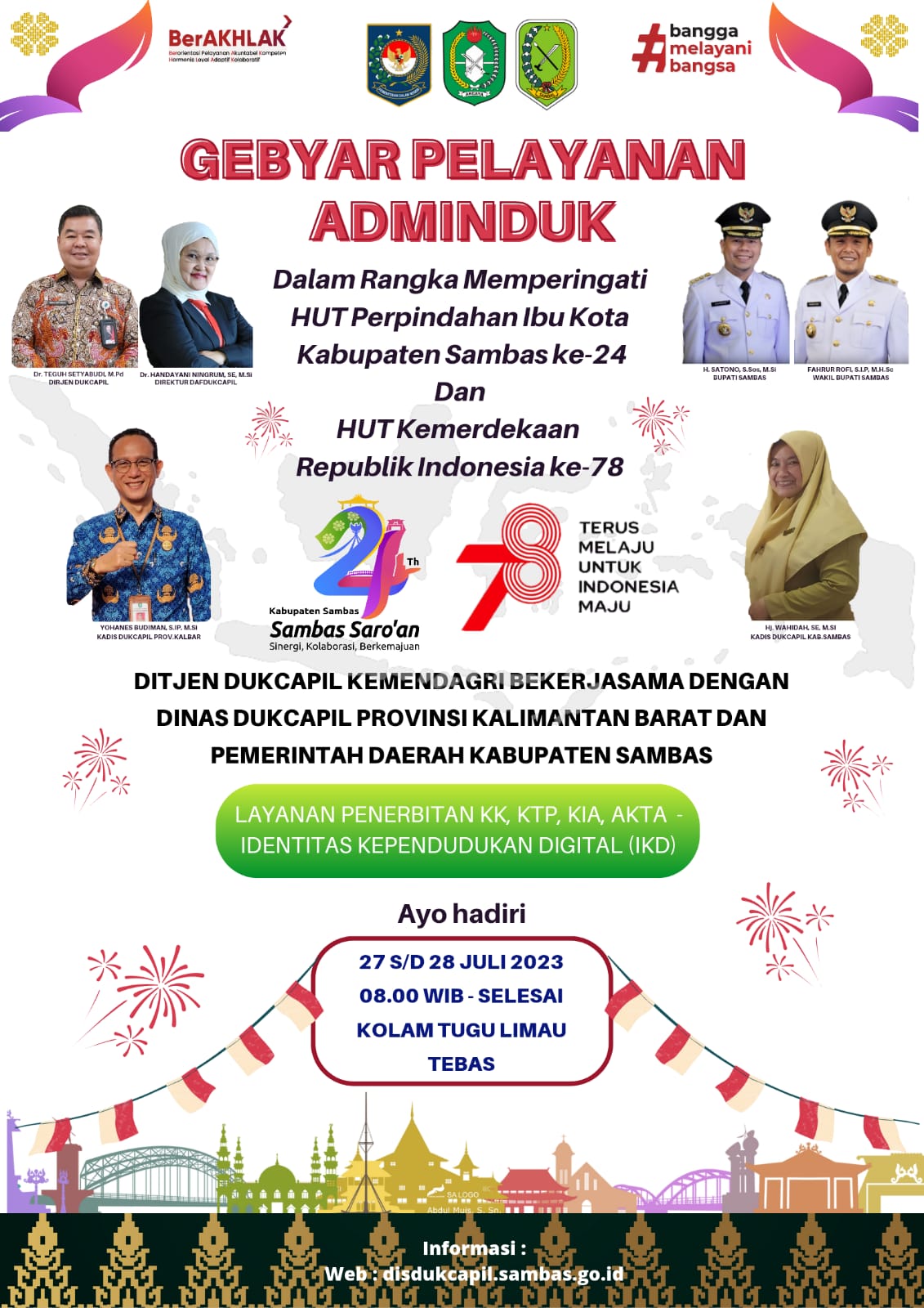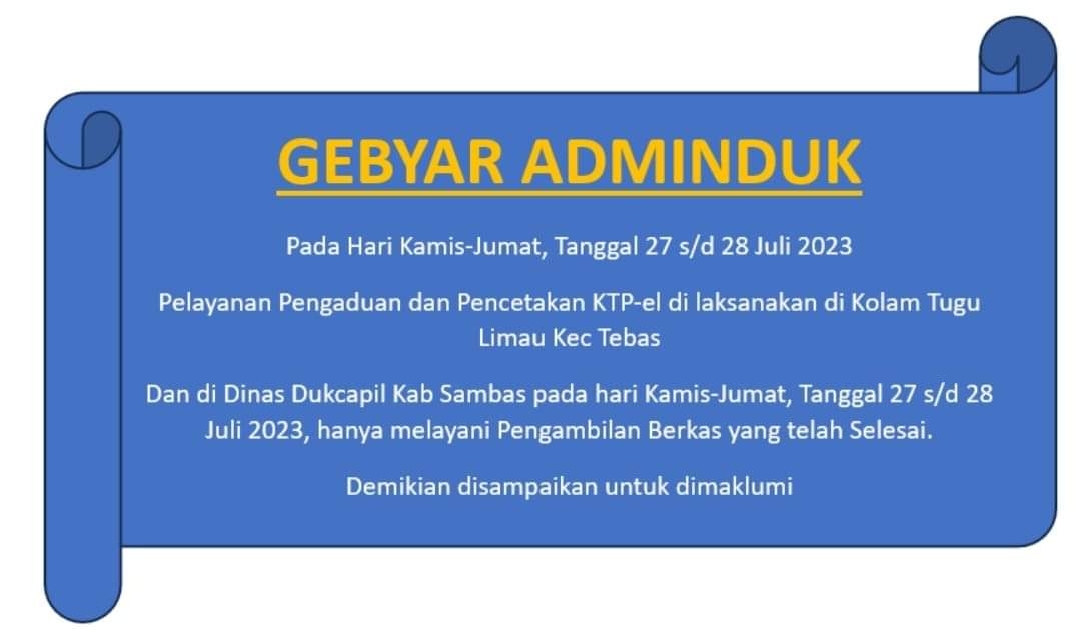 DALAM RANGKA GEBYAR ADMINDUK PENGADUAN DAN PENCETAKAN KTPEL PADA HARI KAMIS -JUMAT TANGGAL 27-28 JULI 2023 DI PUSATKAN DI KOLAM RENANG TUGU LIMAU TEBAS