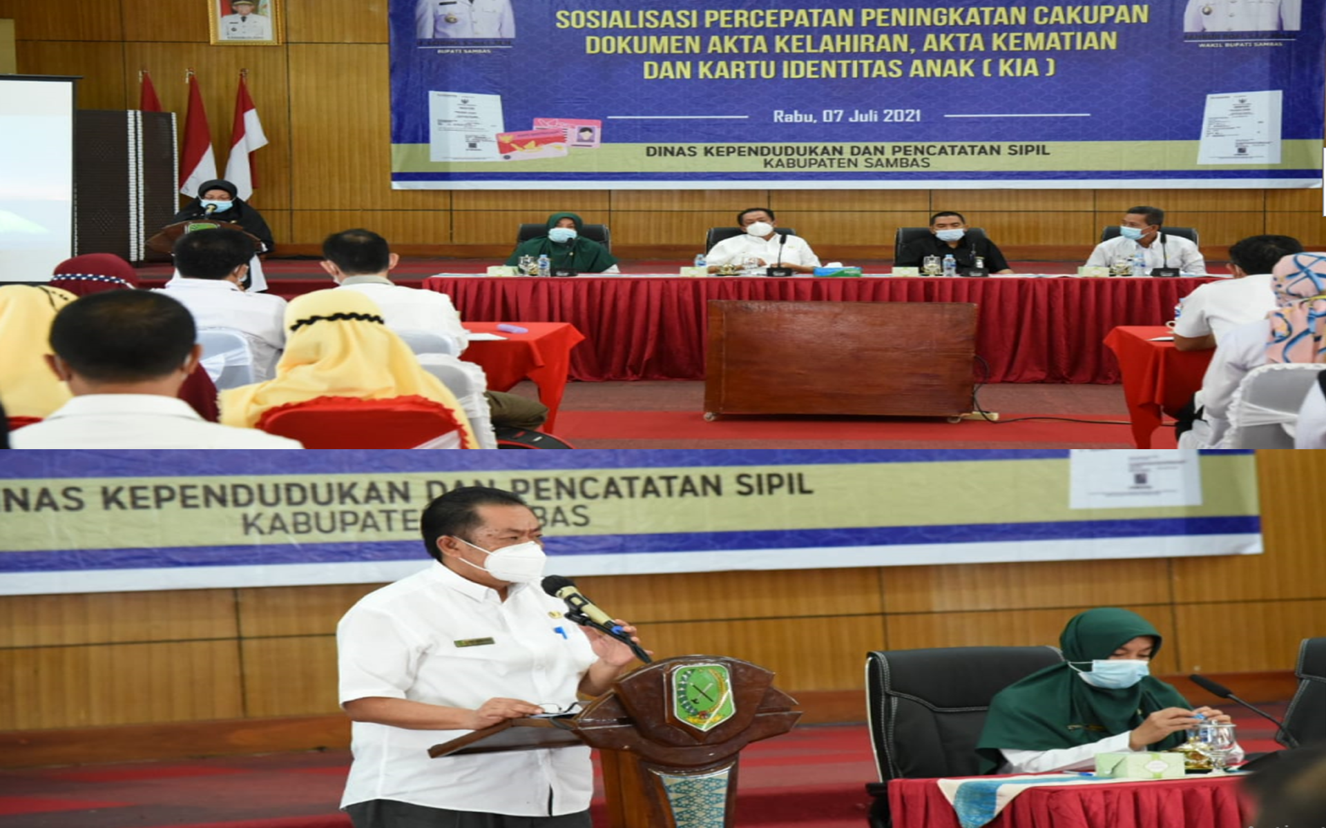 Dinas Kependudukan dan Pencatatan Sipil Kab. Sambas memberikan sosialisasi percepatan peningkatan cakupan kepemilikan Akta Kelahiran, Akta Kematian dan Kartu Identitas Anak (KIA) pada hari Rabu, 7 Juli 2021 di Aula Kantor Bupati Sambas.