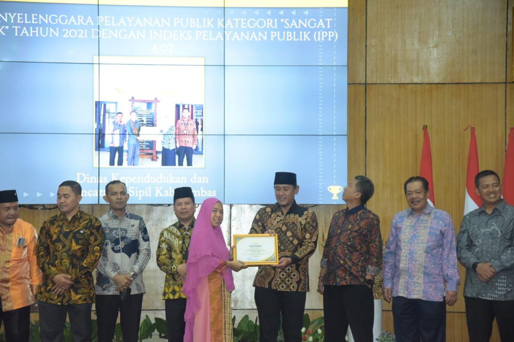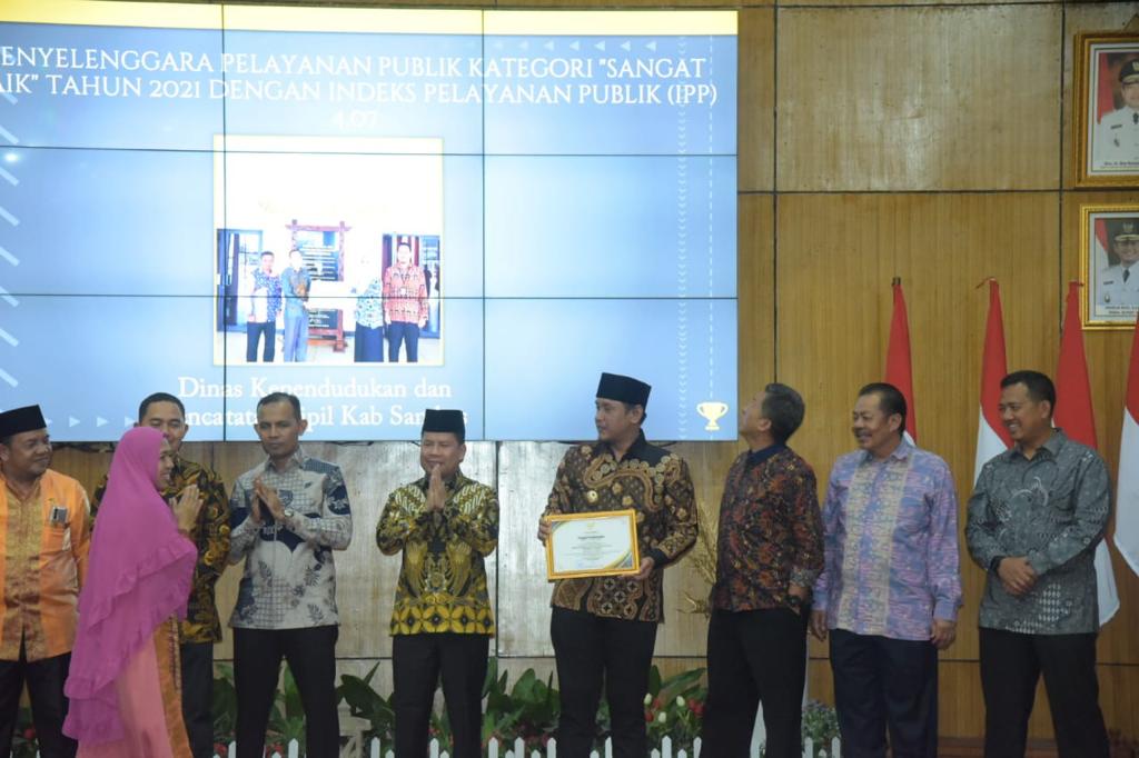 DINAS KEPENDUDUKAN DAN PENCATATAN SIPIL KABUPATEN SAMBAS MENERIMA PENGHARGAAAN INDEK PELAYANAN PUBLIK DALAM RANGKA HUT RI KE 77 TAHUN 2022, YANG DISERAHKAN SECARA LANGSUNG OLEH WAKIL BUPATI SAMBAS BAPAK FAHRUR ROFI, S.I.P.,M.H.SC., KEPADA KEPALA DINAS KEPENDUDUKAN DAN PENCATATAN SIPIL KABUPATEN SAMBAS YANG DIWAKILI OLEH KABID YANCAPIL AGUSMINI ERAWATI, SE
