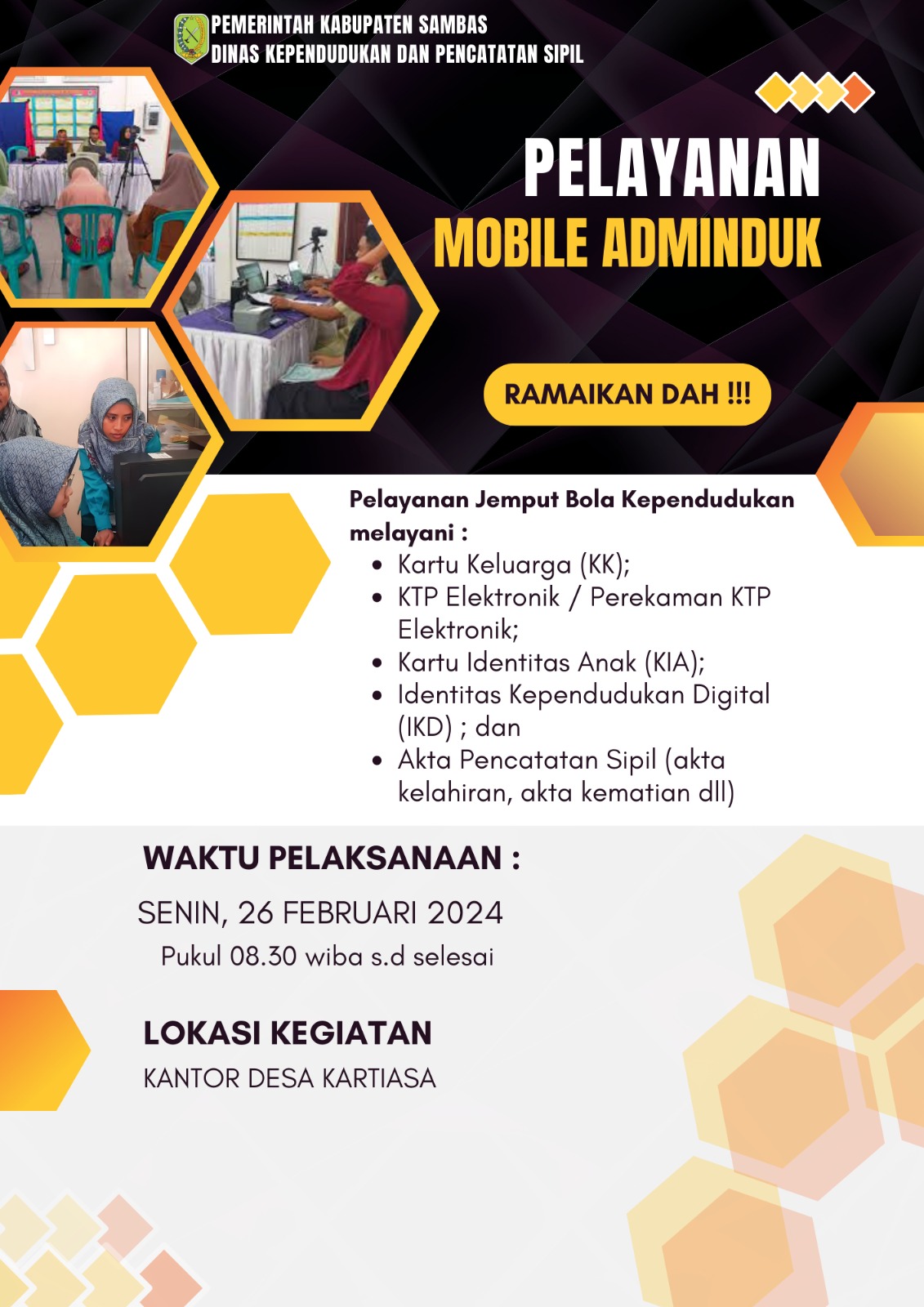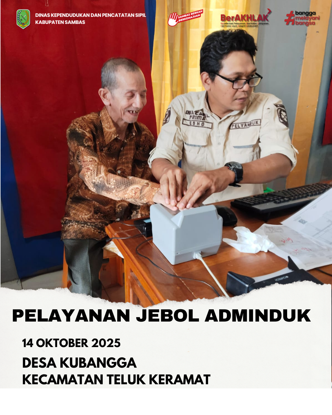 Dalam rangka mendekatkan pelayanan administrasi kependudukan dan pencatatan sipil kepada masyarakat, Dinas Kependudukan dan Pencatatan Sipil Kabupaten Sambas melakukan Kegiatan Jemput Bola (JEBOL) di Tingkat Desa. Kegiatan yang dilaksanakan pada hari Selasa 14 Oktober 2025 bertempat di Kantor Desa Kubangga Kecamatan Teluk Keramat mencakup berbagai jenis pelayanan yaitu perekaman KTP Elektronik, pembuatan Kartu Keluarga, Aktivasi Aplikasi Identitas Kependudukan Digital (IKD), pembuatan Akta Kelahiran, pembuatan Akta Kematian maupun Dokumen Kependudukan lainnya. Pelayanan Adminduk ke Desa ini menjadi solusi bagi masyarakat untuk mengurus dokumen kependudukannya tanpa harus berangkat ke Kabupaten.