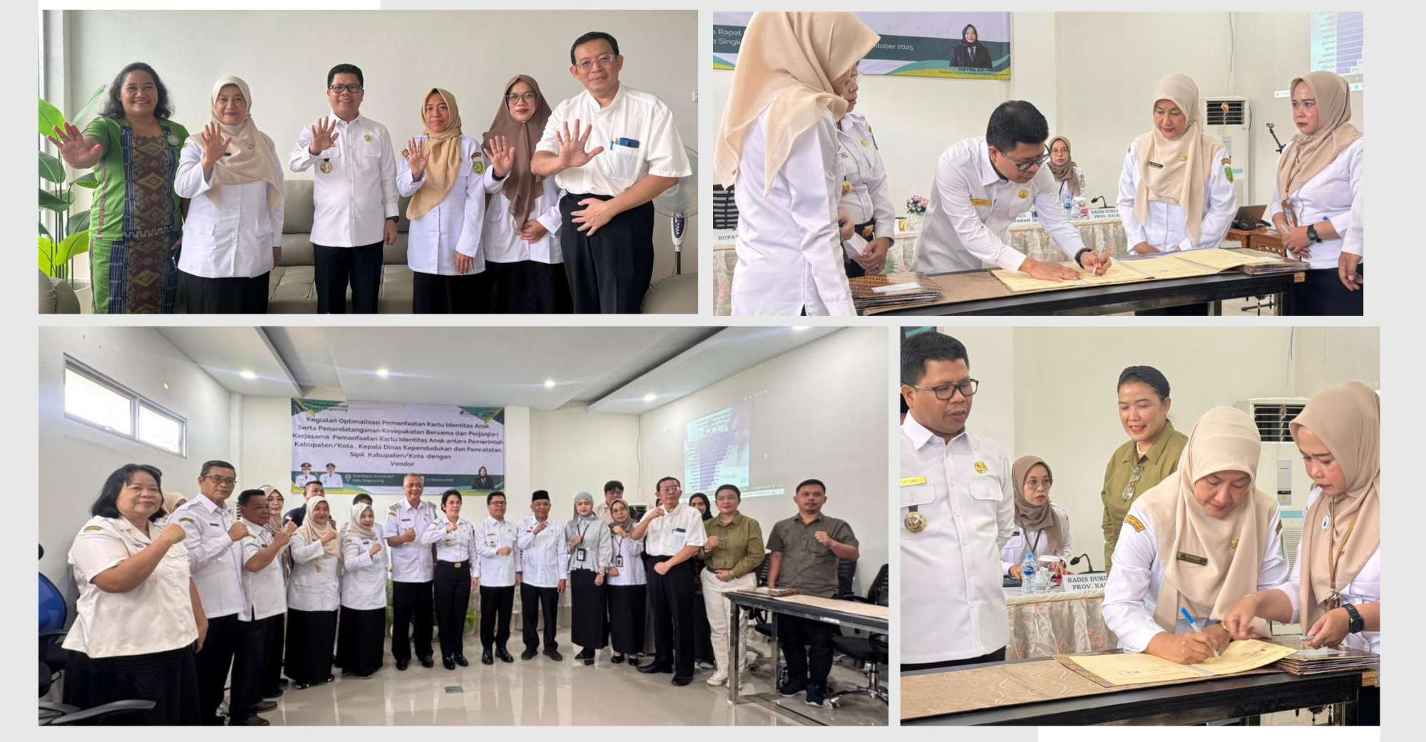Aula Rapat Disdukcapil Kota Singkawang - 22 Oktober 2025, Penandatangan Kesepakatan Bersama Antara Pemerintah Kabupaten Sambas dengan Vendor tentang Peningkatan dan Percepatan Layanan Administrasi Kependudukan serta Penandatangan Perjanjian Kerjasama Antara Dinas Kependudukan dan Pencatatan Sipil Kabupaten Sambas dengan Vendor tentang Pemanfaatan Kartu Identitas Anak. Ada 9 (sembilan) vendor antara lain Optik Rumah Kacamata Singkawang, Ayam Iris Crispy Singkawang, Mikaila Travel Singkawang, Murayya Hill Singkawang, PT. Dayang Resort Mandiri Singkawang, Kahyangan Resort Bengkayang, Taman Rekreasi Teratai Indah Singkawang, Taman Cinta Waterboom Singkawang, Hotel Horison Ultima Singkawang.